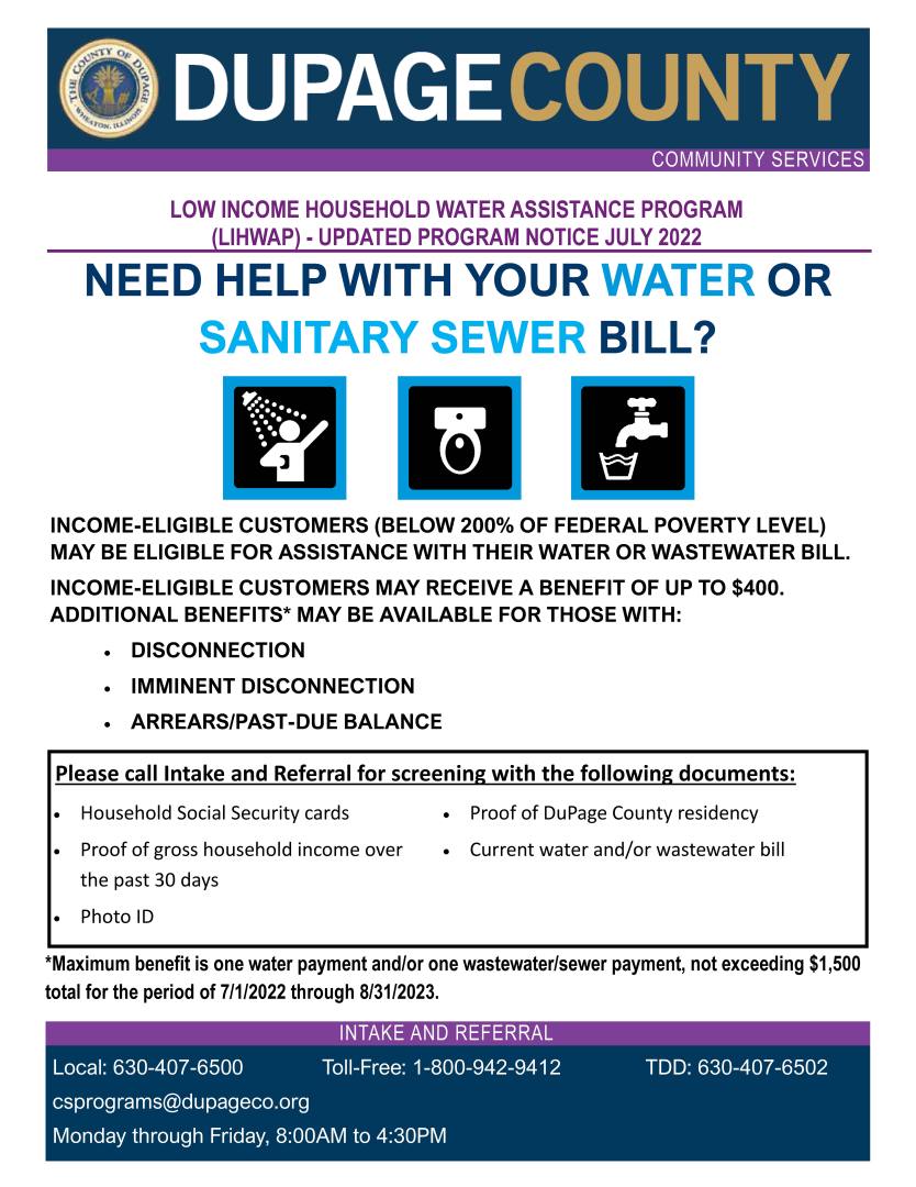 District customers who need help paying their sewer bill may qualify for DuPage County’s Low Income Household Water Assistance Program (LIHWAP).